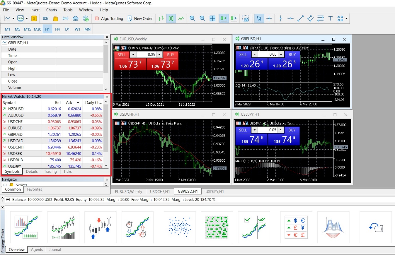 تتضمن القائمة الرئيسية جميع الوظائف تقريبًا في MT5 ، والتي تساعد المستخدمين على إجراء عمليات الرسم البياني وتحليل الأدوات وإعدادات النظام الأساسي ، إلخ. تتكون القائمة الرئيسية من الوظائف الرئيسية لكل من [ملف] و [عرض] و [إدراج] و [أدوات المخطط] و [نافذة] و [مساعدة].