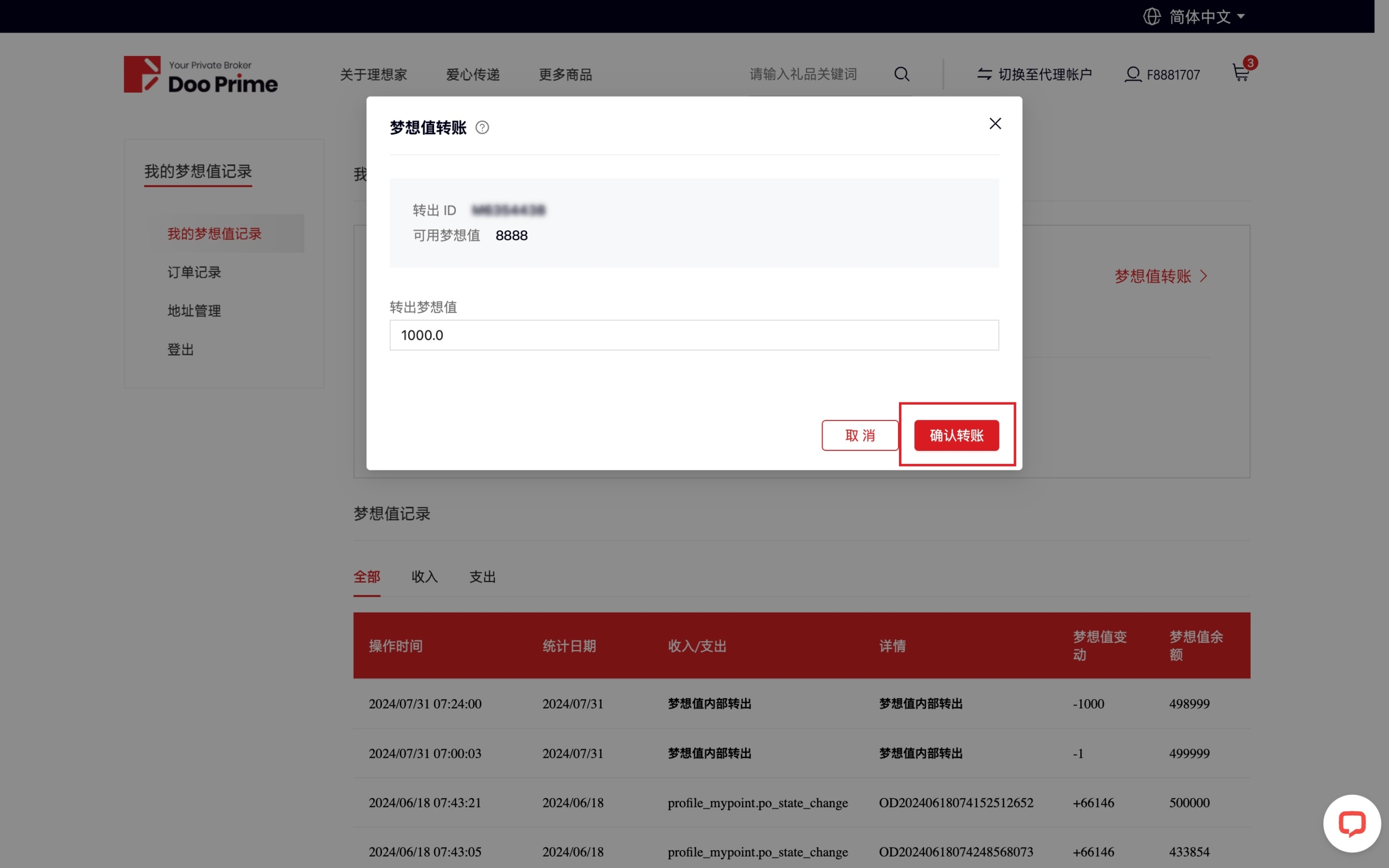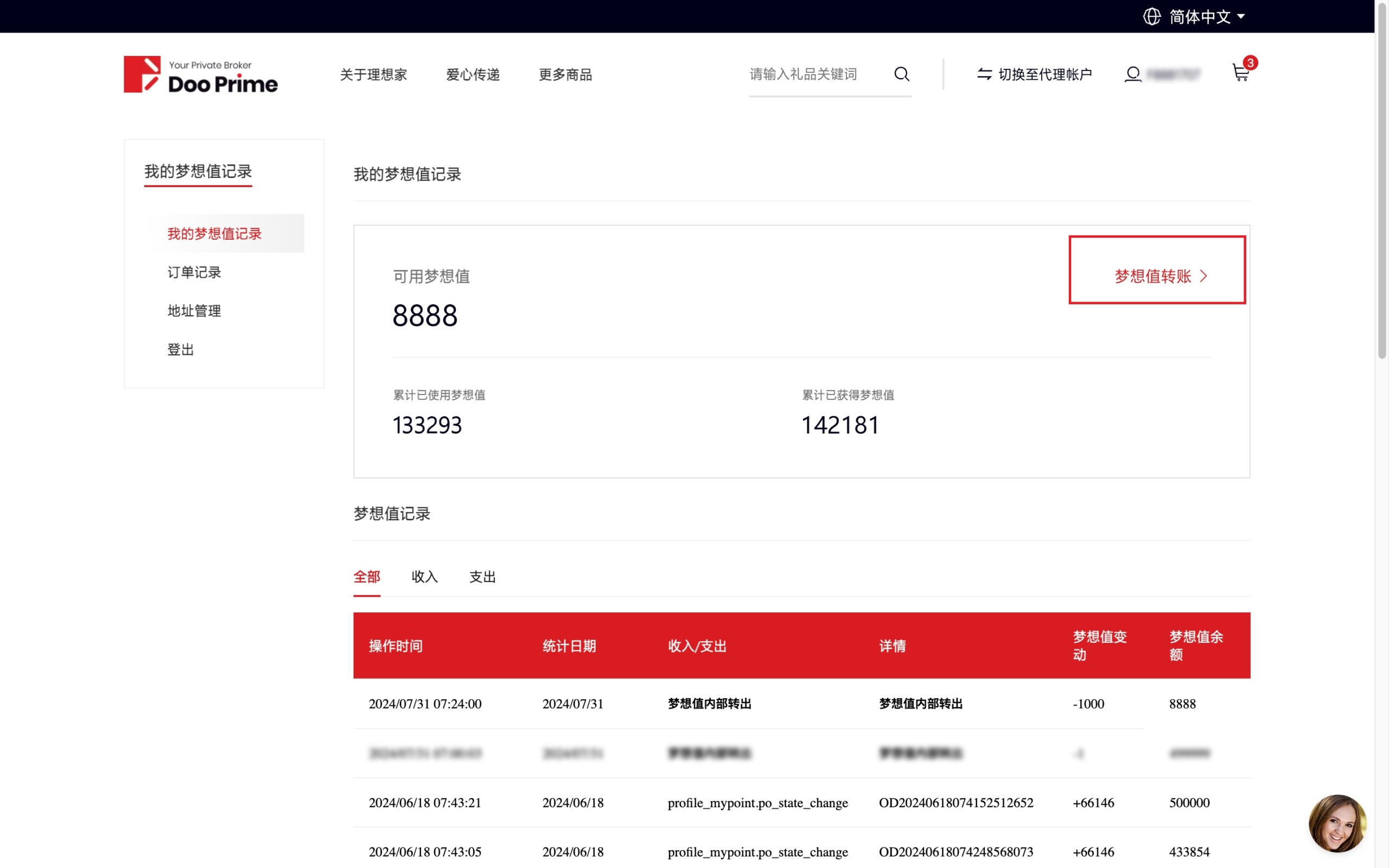 Your Dream Value points can be transferred between personal customers or agent accounts with the same name and used to redeem gifts or services provided in the mall, but cannot be transferred, discounted or traded to other customers.
