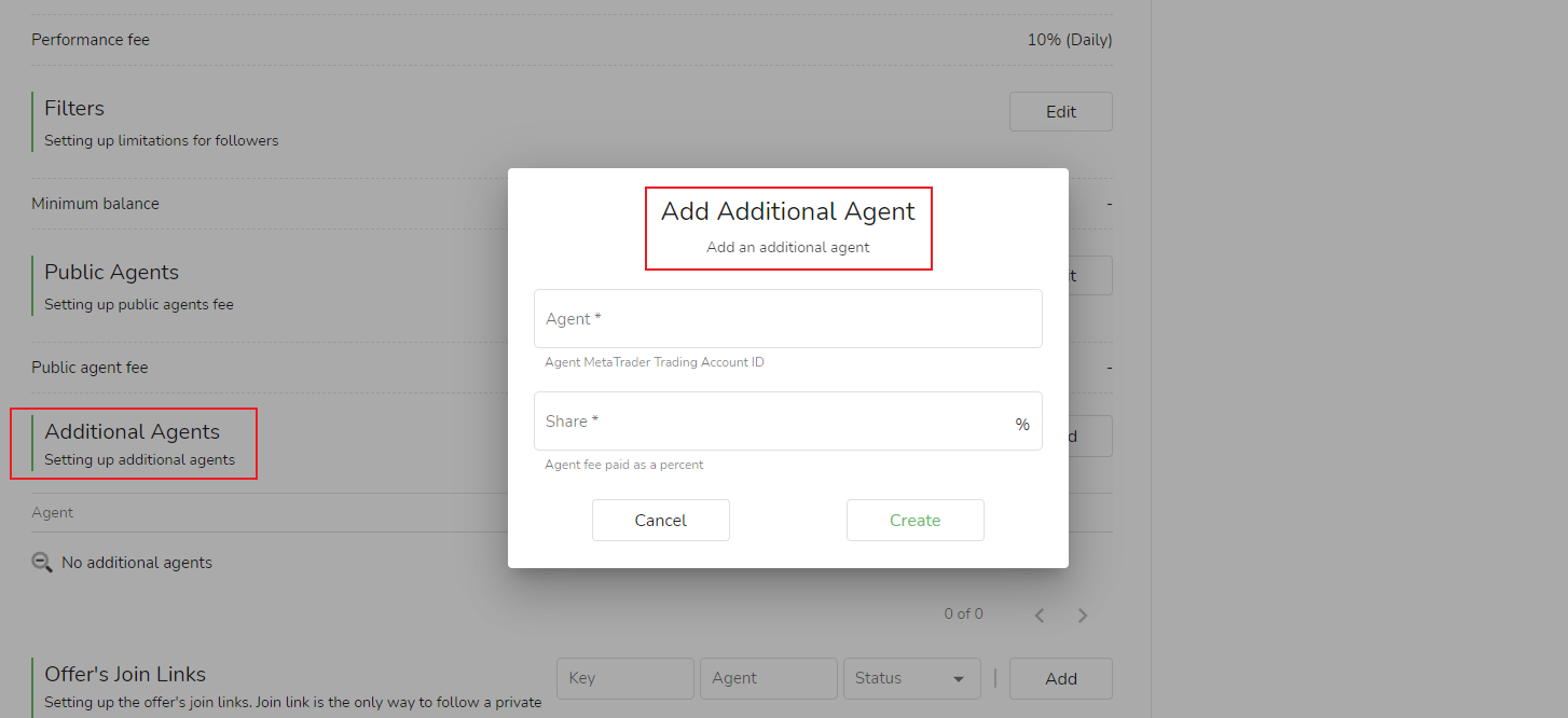 Signal Source Partners:Compared with introduction and promotion, the signal source partner has a closer relationship with the signal source. The signal source can be added by clicking [Add], then filling in the MetaTrader trading account of the signal source partner, setting the signal source partner fee by a percentage, and then clicking [Create] to add the signal source partner.