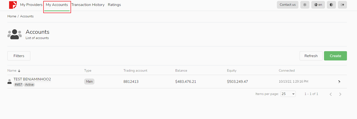 On the [My Account] page of the signal source, you can add a new trading account by clicking the green [Create] button. However, this account cannot be used to log in, and can only be selected as a signal source, follower or set up to receive performance fees.