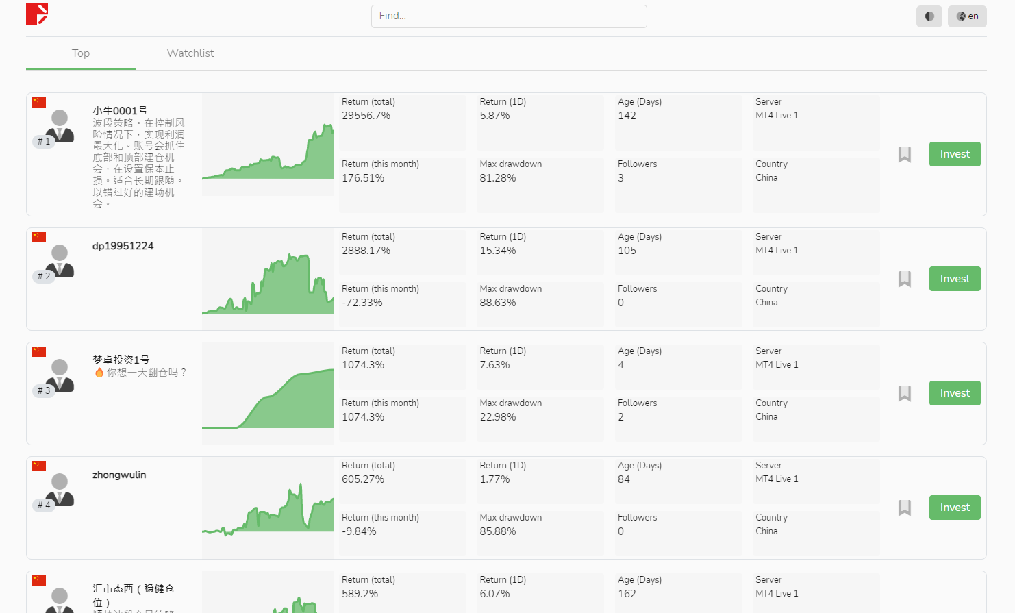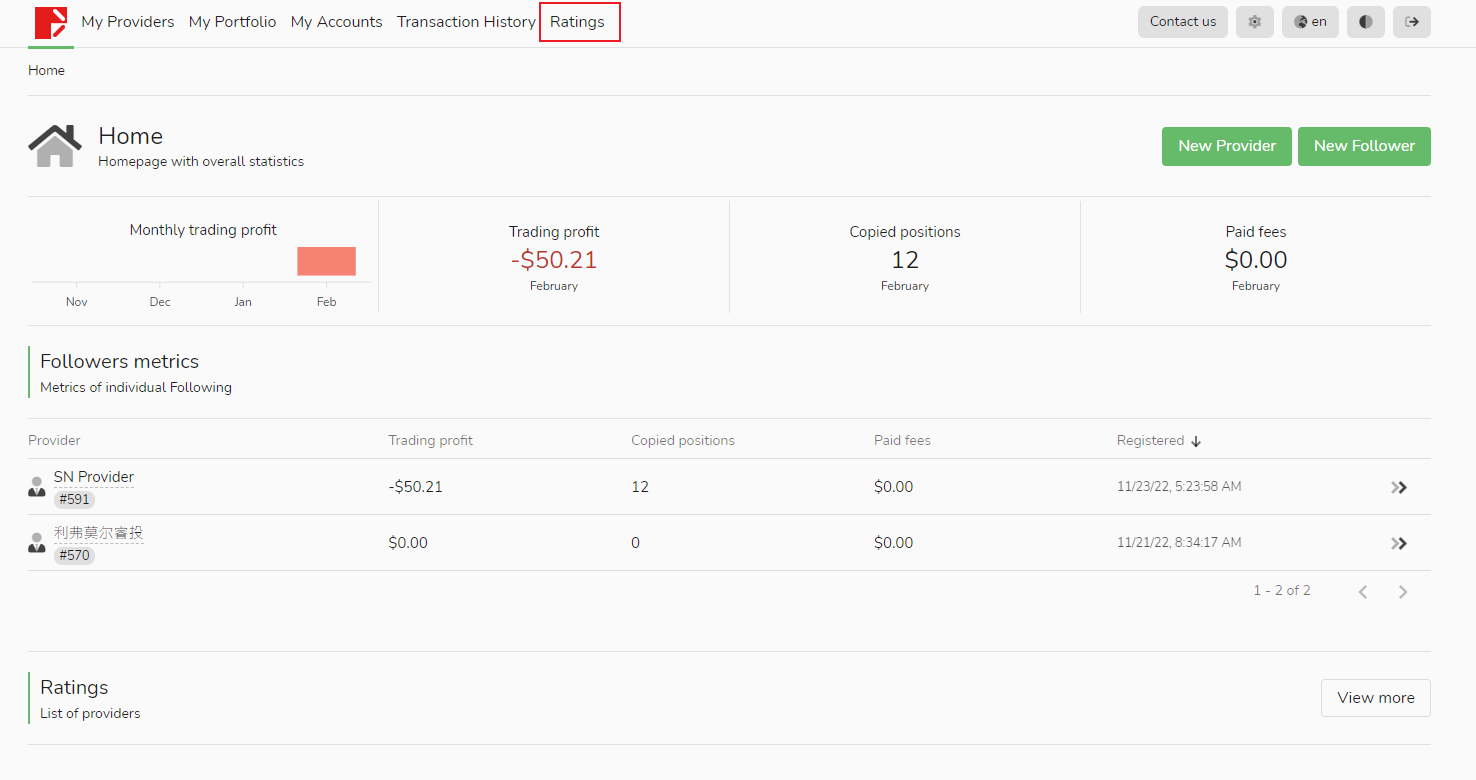 In the rating module, followers can view the detailed trading performance statistics of each provider, such as return rate, average profitable transaction, average trading market and investment varieties, etc.