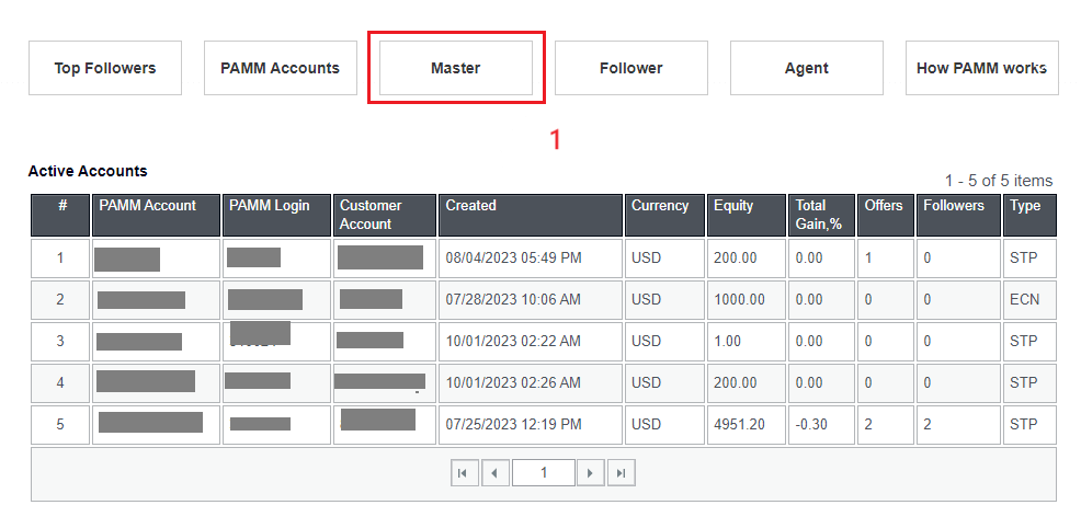b. When a new PAMM account is successfully created, the user will see the created account in the "Active Accounts" section of the "Master" page.