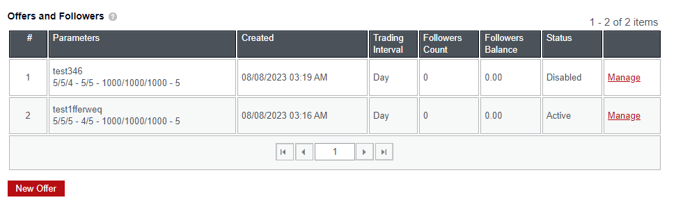 b. Click on “New Offer”. The “Offers and Followers” table displays information about all offers, their status, the number of followers and the total “Follower Balance” for each offer.