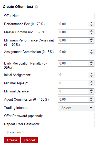c. Fill in the ”Create Offer” form (for more information about the ”Offer Parameters” description, see Offer Parameters). Check the ”I Confirm” checkbox and click “Create”.