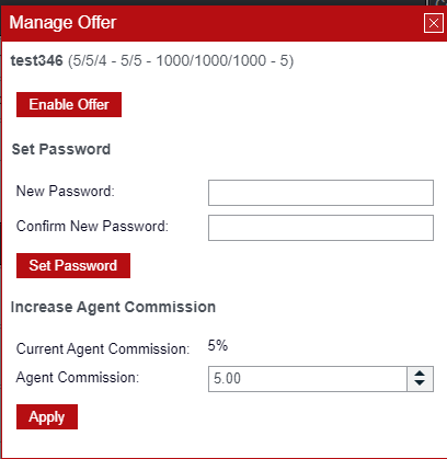 d. To change ”Agent Commission” or/and “Password”, click ”Manage“ in the ”Offers and Followers” table. Select ”Disable” or ”Enable Offer” for the offer status.