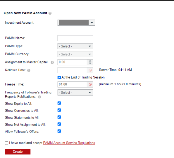 d. Fill in the following details for the new PAMM account and click ”Create”. Make sure to read and check the box of terms and regulations consensual.