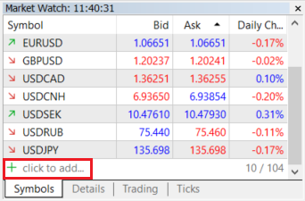 1. Add the code of the relevant trading symbol directly under the window of market quotation: