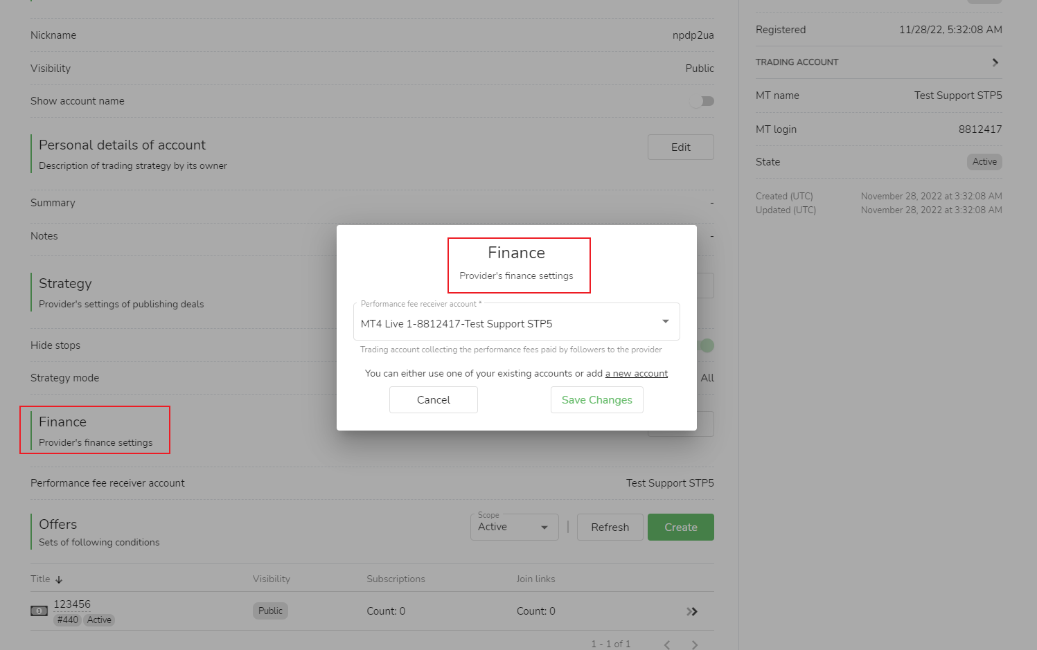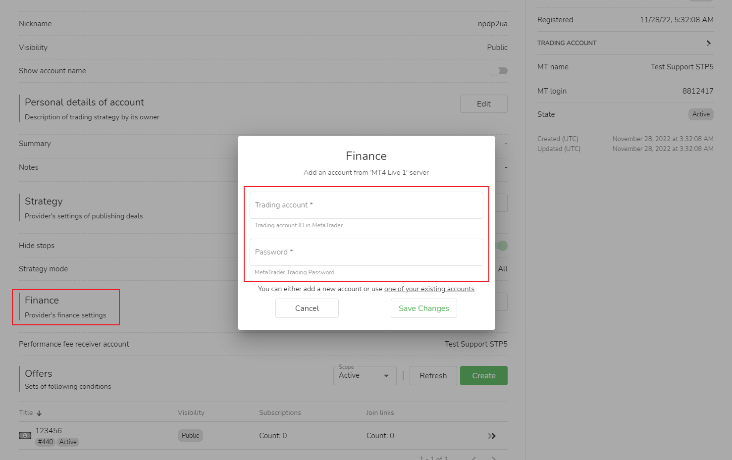 실적 수수료 수락 계정:시그널 소스가 팔로워를 모아 시그널 소스에 성과 수수료를 지불하는 거래 계정은 기존 계정을 선택하거나 새 계정을 추가할 수 있습니다.새 계정을 추가하는 과정에서 거래 계정(즉, MetaTrader의 거래 계정) 및 암호(즉, MetaTrader 거래 암호)를 입력한 다음 [변경 사항 저장]을 클릭하면 성공적으로 설정이 완료됩니다.