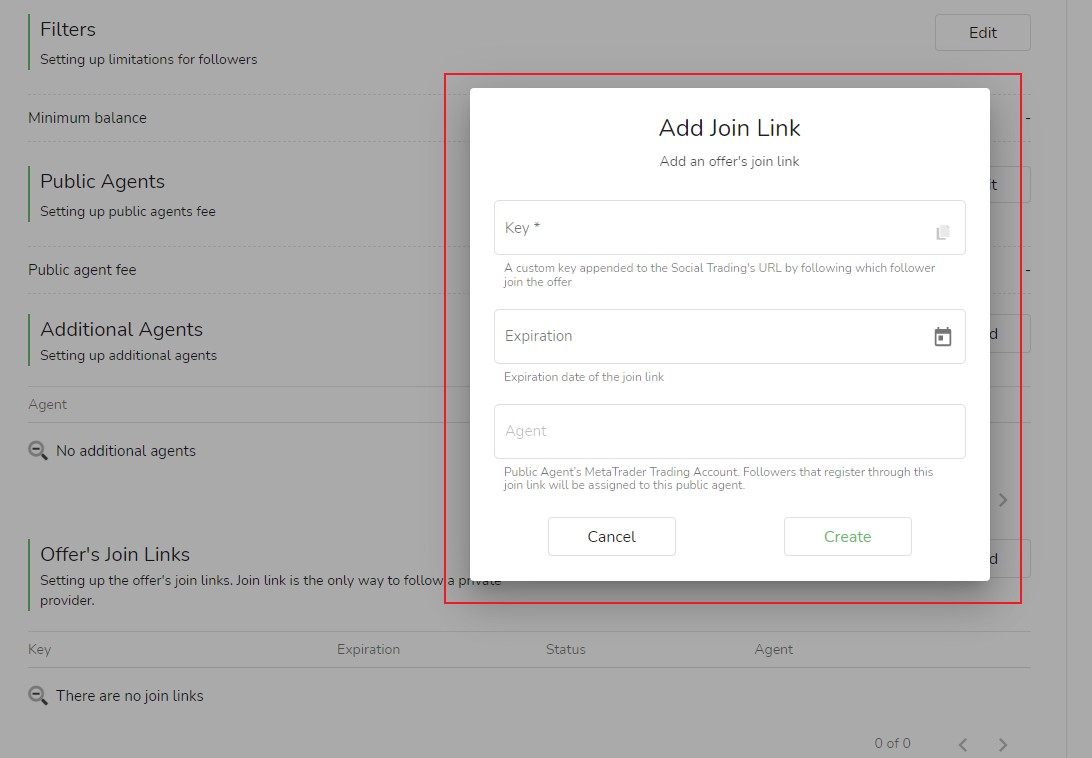 Depois que o link de adesão for criado com sucesso, ele será exibido na posição acima. Este link de adesão terá os parâmetros da conta de negociação MetaTrader do introdutor, então os seguidores registrados através do link de adesão serão atribuídos diretamente ao apresentador correspondente.