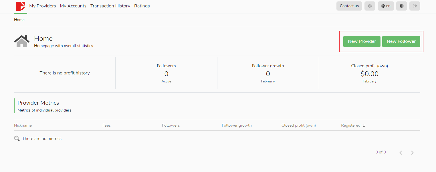 Na página [Minha conta] da fonte do sinal, você pode adicionar uma nova conta de negociação clicando no botão verde [Criar]. No entanto, esta conta não pode ser usada para fazer login e só pode ser selecionada como fonte de sinal, seguidora ou configurada para receber taxas de desempenho.