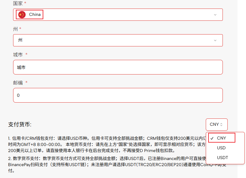 - 在付款页面 “国家” 处选择您希望支付的货币所属国家以及“州”,并在 “支付货币” 下拉菜单中选择对应币种(如:CNY)。