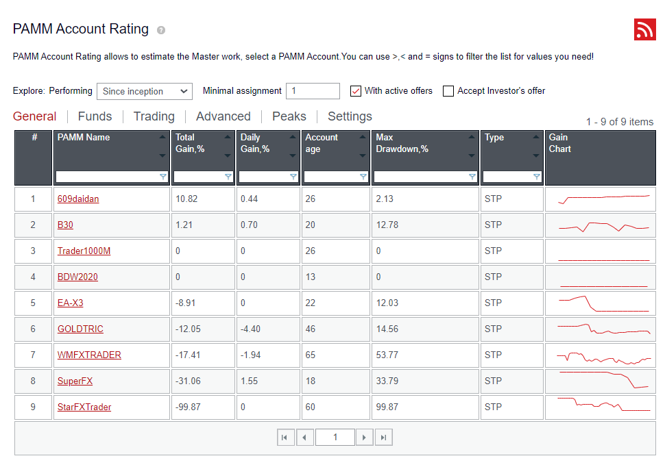 a. Đăng nhập vào trang web PAMM và nhấp vào "Tài khoản PAMM" trong menu chính để xem các tài khoản PAMM có sẵn (chỉ nhấp vào "Ưu đãi đang hoạt động" để xem danh sách các tài khoản PAMM có ưu đãi đang hoạt động):